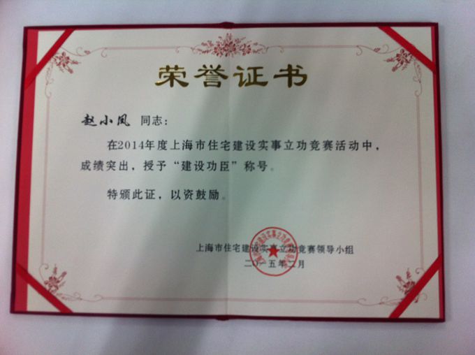 祝賀趙小鳳女士在2014年度上海市住宅建設(shè)實(shí)事立功競賽活動中,獲得”建設(shè)功臣“稱號。