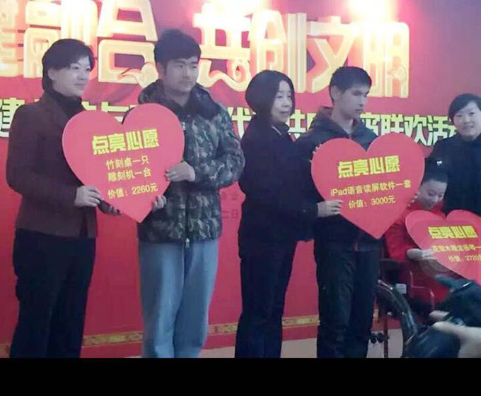 我司黨支部和明達物業(yè)黨支部聯(lián)建2016新春專題活動共同參與支持殘障人士“點亮心愿”活動,幫助他們實現(xiàn)心愿,點亮夢想之燈!也許我們的幫助微不足道,但對他們來說也許是通往成功路上的一大步,愿我們支助的徐曄飛小朋友能在竹刻世界越飛越高!