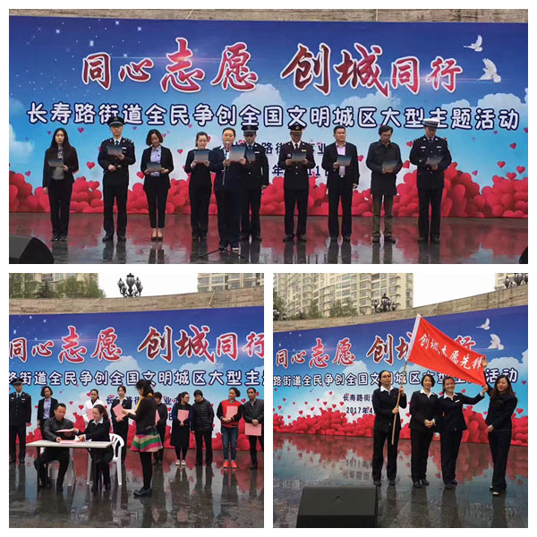 善德普陀、同心同夢、同心志愿、創(chuàng)城同行,共同建設(shè)文明衛(wèi)生的家園。普陀區(qū)長壽路街道全民爭創(chuàng)全國文明城區(qū)大型主題活動2017年4月11日上午9點在長壽公園圓滿舉行!活動現(xiàn)場長壽路街道相關(guān)領(lǐng)導(dǎo)與轄區(qū)內(nèi)沙田物業(yè)等10家文明單位簽訂《爭創(chuàng)全國文明城區(qū)公約書》,并授予沙田物業(yè)“創(chuàng)城志愿先鋒”團隊。沙田物業(yè)一定竭力為普陀區(qū)成功爭創(chuàng)全國文明城區(qū)、鞏固國家衛(wèi)生區(qū)貢獻力量!