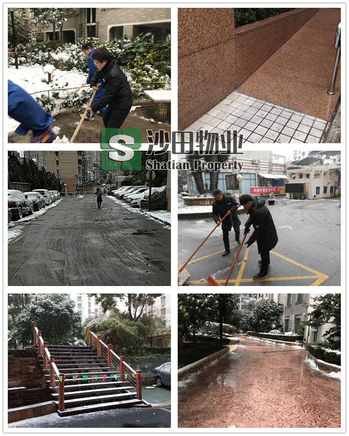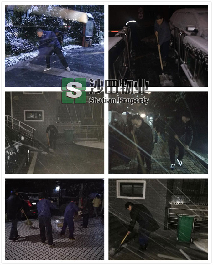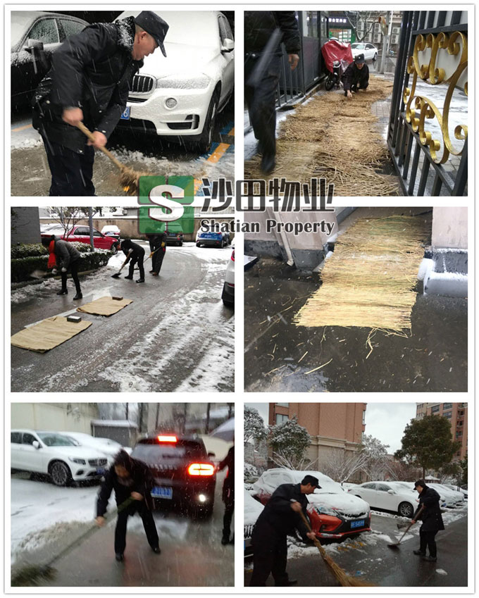 2018年1月25日,上海市發(fā)布今冬暴雪黃色預(yù)警,我司全員進(jìn)入緊急備戰(zhàn)狀態(tài),隨時準(zhǔn)備應(yīng)對道路結(jié)冰、水管冰凍等各類突發(fā)狀況。從25日早上起,各個項目就開始道路鏟雪的工作,確保小區(qū)內(nèi)主干道路不會結(jié)冰,并在各個主要道口斜坡鋪設(shè)草墊做防滑處理。員工們輪流休息,輪番上陣清掃,每2小時清掃一次敏感地段的積雪,一直工作到26日早上。